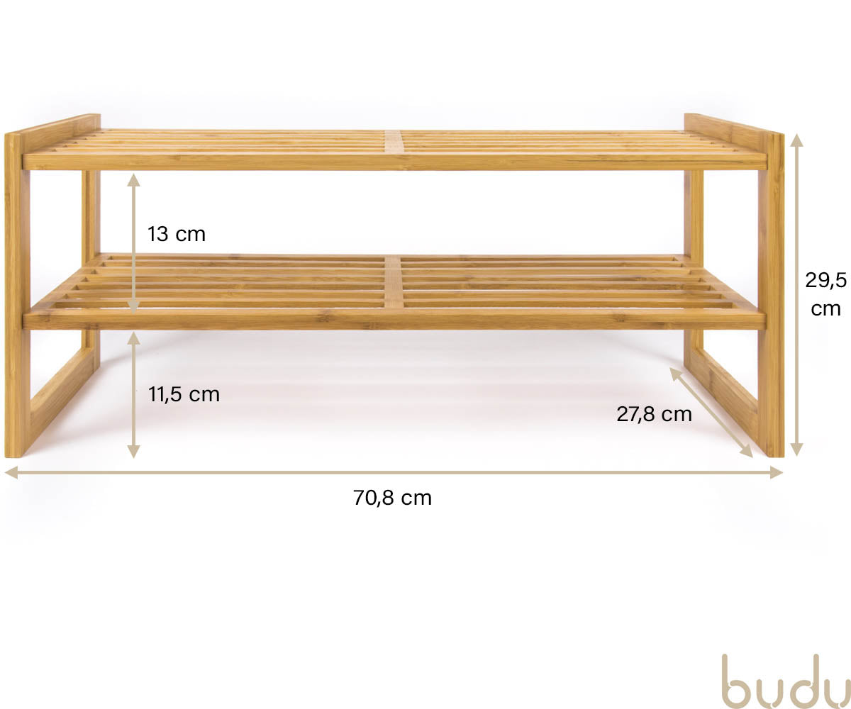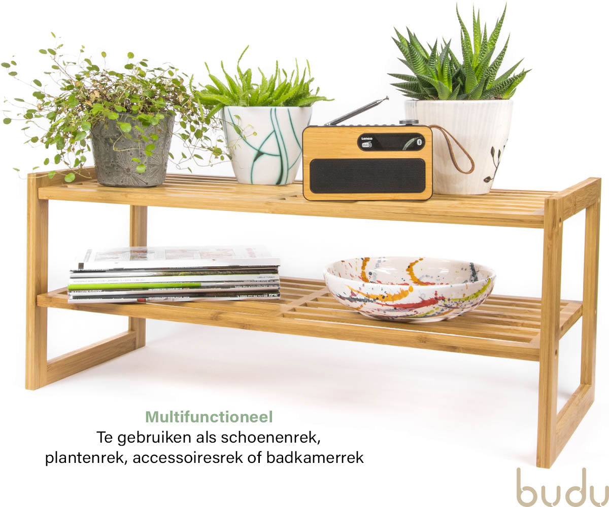 Op zoek naar een schoenenrek van hout? Dit schoenenrek biedt plaats aan ongeveer 9 paar schoenen. Het schoenenrek heeft 2 niveaus, waar elk 3 paar schoenen op geplaatst kunnen worden. Ook onder het eerste niveau is ruimte voor 3 paar schoenen. Heb je meer ruimte nodig? Dan heb je de mogelijkheid om meerdere rekjes op elkaar te plaatsen. De bevestigingsmaterialen hiervoor worden meegeleverd. Het houten schoenenrek is gemaakt van bamboe en heeft een luxe uitstraling.